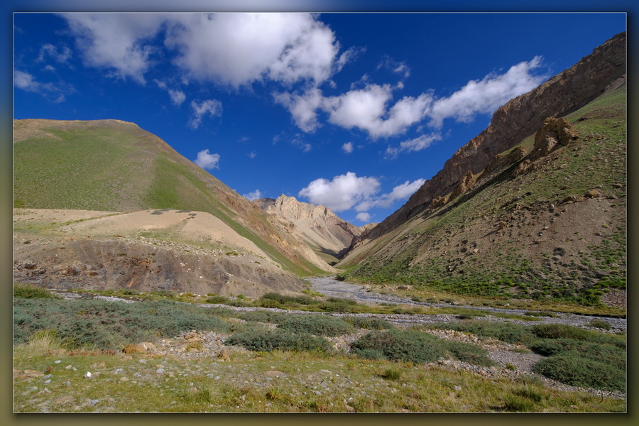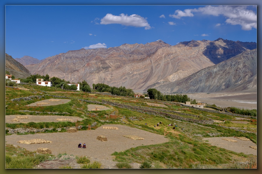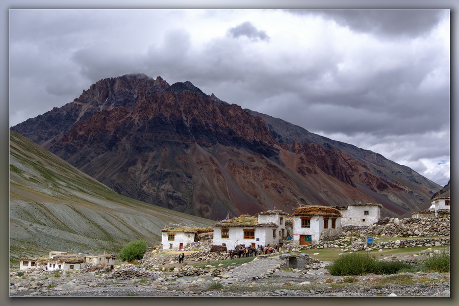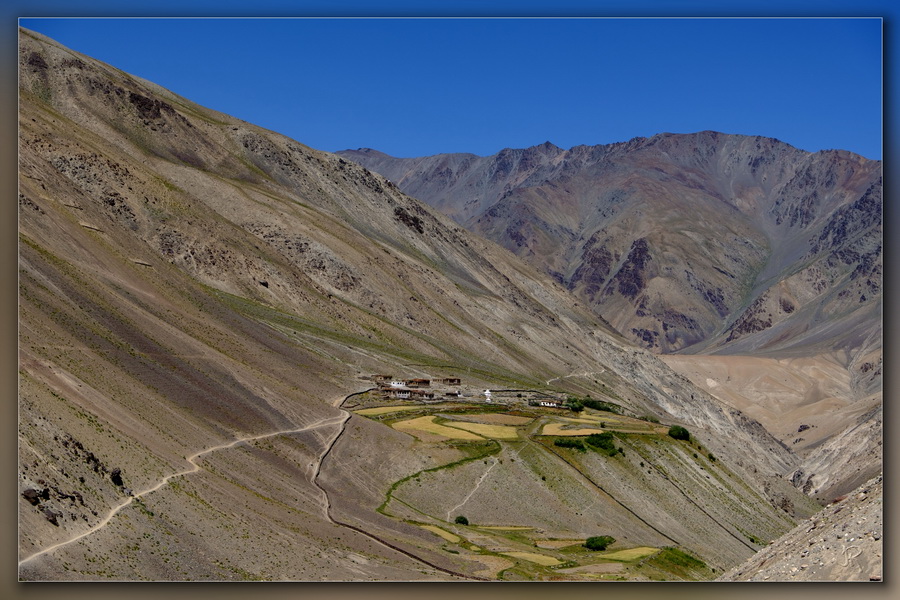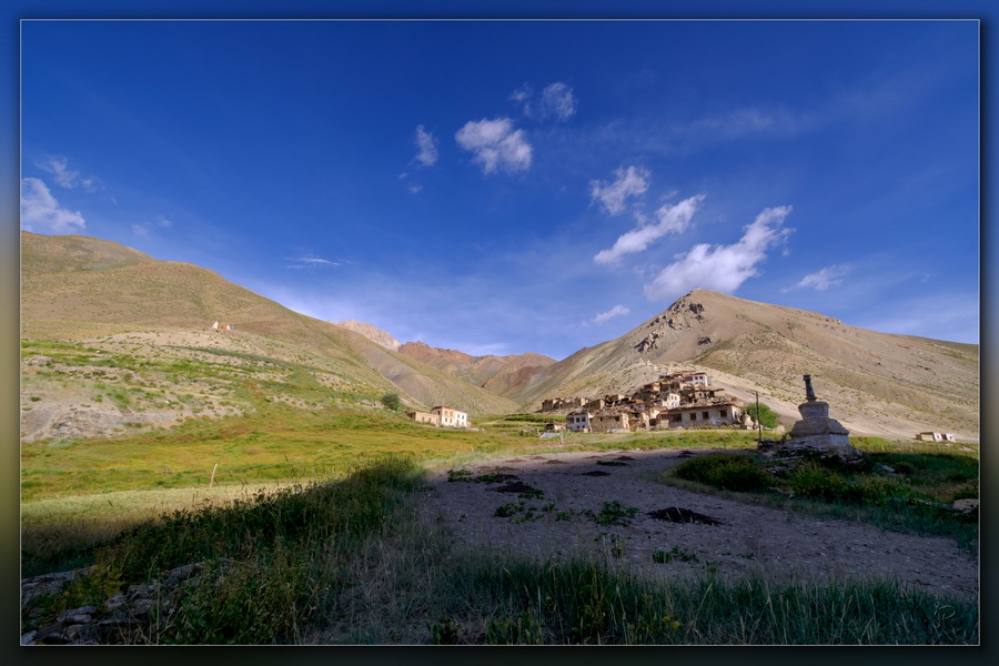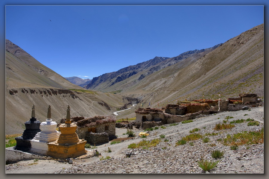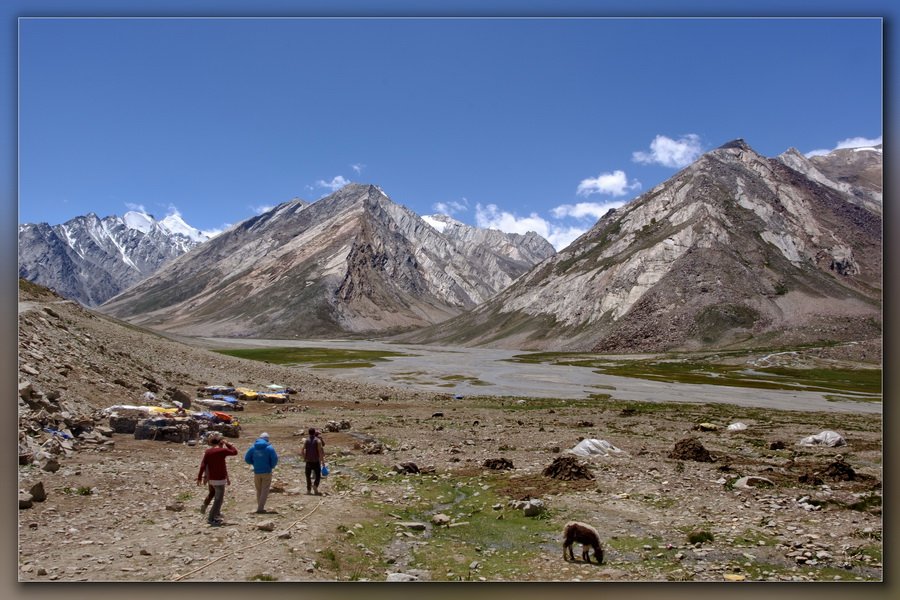 29 août – Après les quelques averses de la nuit, le ciel c’est ouvert sur une nouvelle journée à dominante bleu. Notre chemin nous conduit aujourd’hui à Kargyak, que nous dépasserons de quelques kilomètres afin de raccourcir l’étape de demain. En fin de matinée, petit arrêt à Sking pour rencontrer Khetup, la maman de Tenzin, la petite protégée de nos amis Igino et Michèle. Elle n’a pas vu sa fille depuis deux ans… Tenzin étudie dans une école de Dharamsala dans laquelle les grandes vacances sont en hiver. En cette saison, les accès au Zanskar sont très difficiles. De ce fait, la jeune fille reste à Dharamsala chez sa tante qui habite non loin. La maman nous confie un petit coli de « friandises » pour sa fille. En fin d’après-midi, nous installons le camp avec vue sur le Gomboranjon. La fin du périple est proche.