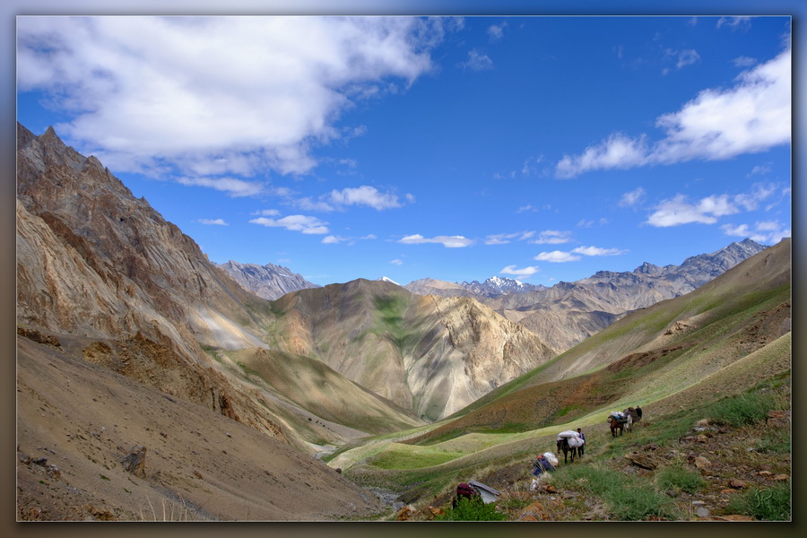 28 août -  Je vous ai déjà présenté le pont népalais de Phuktal il y a deux ans … il n’a pas changé. La journée commence par cette petite épreuve. Laurette le rejoint à pied, son « Petit tonnerre » l’attend de l’autre côté. Ce matin, nous longeons à nouveau la Tsarap jusqu’à la hauteur de Purne pour ensuite suivre le même trajet qu’il y a deux ans, mais avec des étapes un peu plus longues. Nous rejoignons Tangtse en empruntant la route tracée il y a peu. Cette route devrait rejoindre le sommet du col du Shingo La d’ici peu. Sept heures de marche pour rejoindre notre campement. Sur le trajet, nous rencontrons les caravanes des parents amenant leurs enfants à cheval jusqu’au sommet du col où les attend le bus pour Manali et ses écoles. Ils ne les verront plus pendant 10 mois...