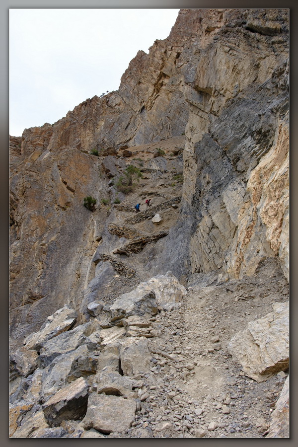En décembre 2014, un important éboulement a complètement obstrué le lit de la Tsarap quelques kilomètres en amont de Phuktal, formant un lac de plus de 10 kilomètres de long retenant plus de 30 millions de mètres cubes d’eau. Le 7 mai 2015 ce barrage a cédé, emportant sur son passage des écoles, des ponts et des fermes dans 40 villages en aval. Le nouveau chemin doit emprunter un tracé parfois surprenant. Le camp de Yatala se situe sur un promontoire à quelques centaines de mètres au-dessus de la rivière. A l’arrivée au camp, une averse nous accueille juste pour nous rappeler que jusqu’à maintenant, la météo était avec nous …