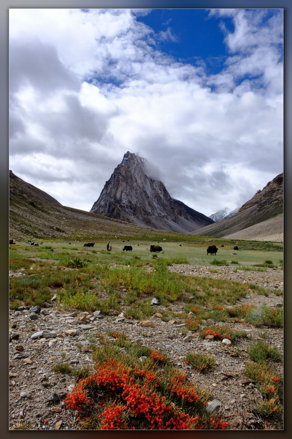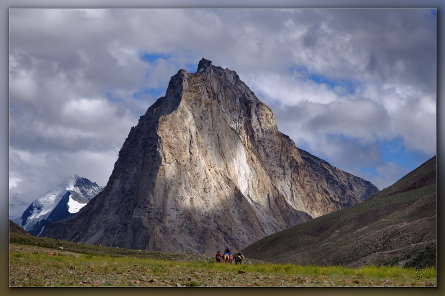 22 août – Aujourd’hui, premier col à plus de 5000m. Le Ningri La, 5150m. Laurette décide d’affronter le monstre à pieds. La montée ne la fait pas trop souffrir. La première partie de la montée n’est pas trop raide, mais très vite, la pente se redresse et les efforts sont intenses. Les mille mètres de dénivelé nous ont mis à rude épreuve. Arrivés au sommet fatigués mais heureux. Pour la descente, Laurette reprendra le cheval, mais pas pour les 300 premiers mètres, trop abruptes pour la pratique de l’équitation. Le cheval descend sans cavalière, avec Targais qui s’assied sur une pierre en attendant l’arrivée de l’Amazone qui progresse difficilement. Le cheval en profite pour filer à l’anglaise retrouver ses comparses au camp suivant. Il lui faudra marcher sur les trois quarts de la descente. Arrivée au camp à 4600m après 7 heures trente d’effort.